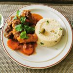4. Heat 2 Tbsp olive oil in the heavy pan (or tagine base) on your stove top. Add the carrots, onions and celery and cook over a gentle heat for 10 minutes so that the onions are soft but not coloured. Add the crushed garlic for the final 3 minutes.